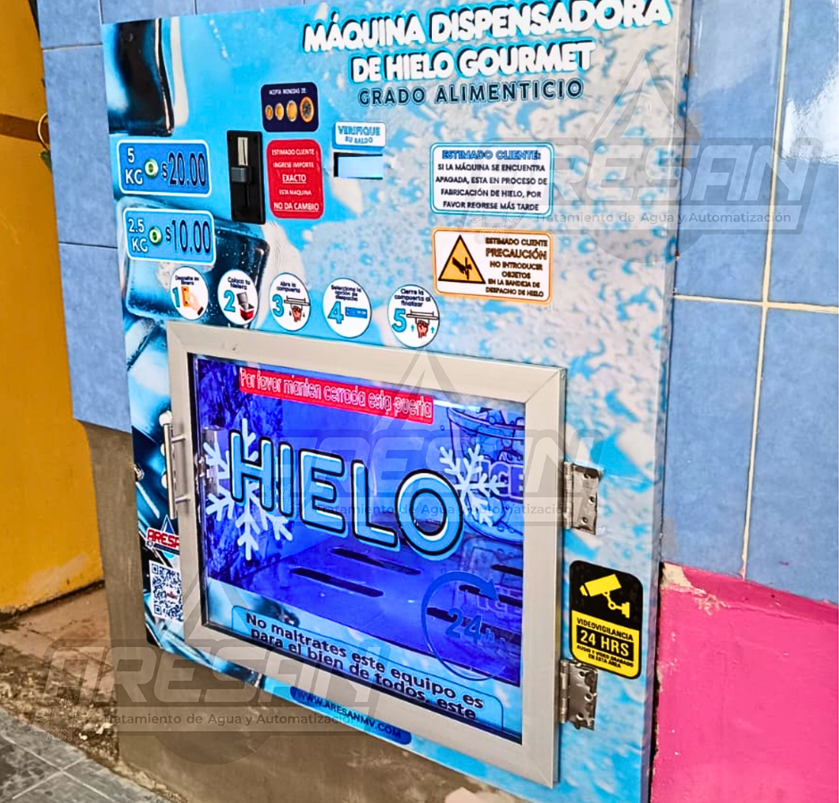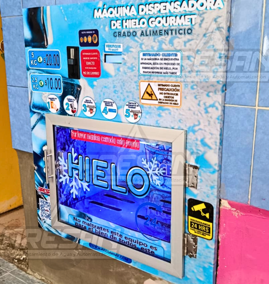 Despacha hasta dos opciones de hielo y dos opciones de agua purificada aceptador de monedas ICT no requiere de
